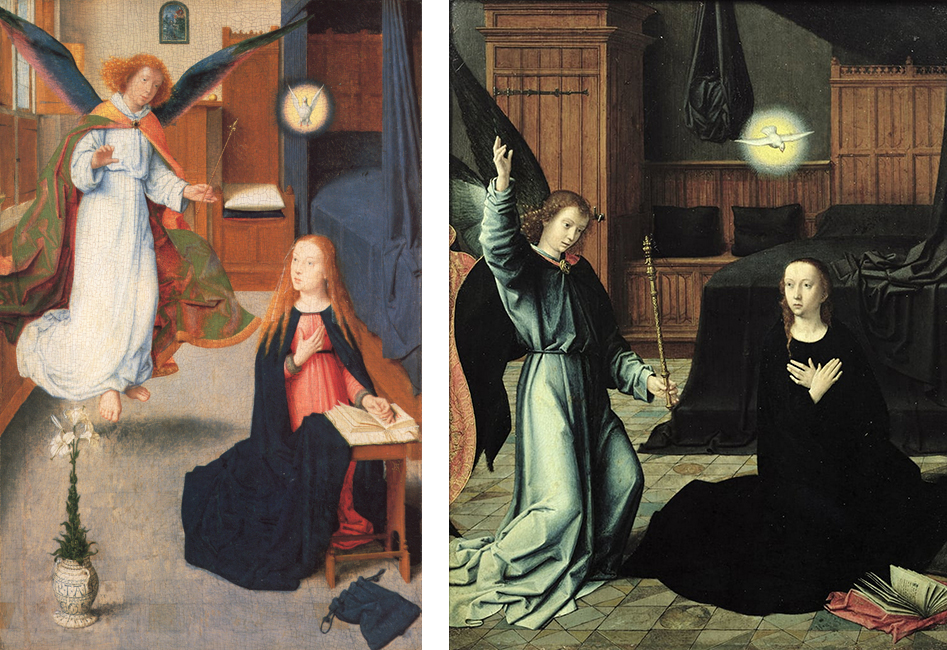 Op beide is de Annunciatie afgebeeld: de Engel die Maria komt aankondigen dat ze een goddelijk kind zal krijgen. Het oudste van de twee (Maria in rood kleed) dateert van rond 1485. Het is van © Detroit Institute of Arts Museum. Het latere paneeltje (Maria in ’t zwart) is van ca. 1506 en eigendom van © Städelsches Kunstinstitut, Frankfurt
