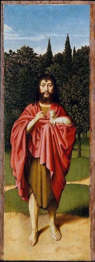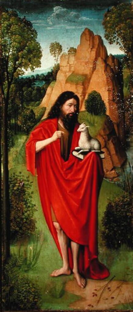 Het middenstuk van dit drieluik (door Van Ouwater) is zoekgeraakt en niemand weet hoe het er uit gezien moet hebben. Op het linker zijpaneel is Johannes de Doper afgebeeld, met het Lam Gods op de arm. Gerard David heeft later ook een schilderij van Johannes gemaakt dat behoorlijk wat overeenkomst heeft met dat van Albert van Ouwater.