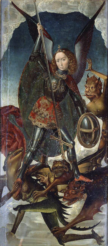 Op het rechter paneel hanteert Sint Michael het kruis als wapen om de duivels die hem belagen van zich af te houden. De wezens uit de onderwereld hebben nog het meeste weg van exotische reptielen met wraakzuchtige smoelen terwijl Michael weinig heldhaftigs of vastberadens in zijn gezichtsuitdrukking heeft, niet erg overtuigend als bestrijder van het kwaad. Het crapuul uit de onderwereld is een tijdsbeeld van de voorstelling die men zich in de 15e en 16e eeuw van bijbelse begrippen als de hel en de onderwereld maakte. Een latere meester in dit genre was natuurlijk Jeroen Bosch.