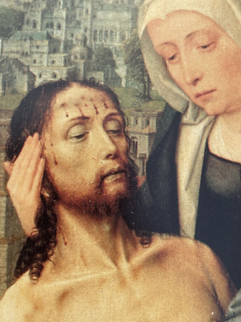 Maria omarmt het lichaam van haar zoon. Ook hier symboliek: de schedel, de diverse plantensoorten. Op het voorhoofd van Christus zijn vijf littekens die door de doornenkroon veroorzaakt zijn. Het schilderij zal tussen 1495 en 1500 geschilderd zijn.