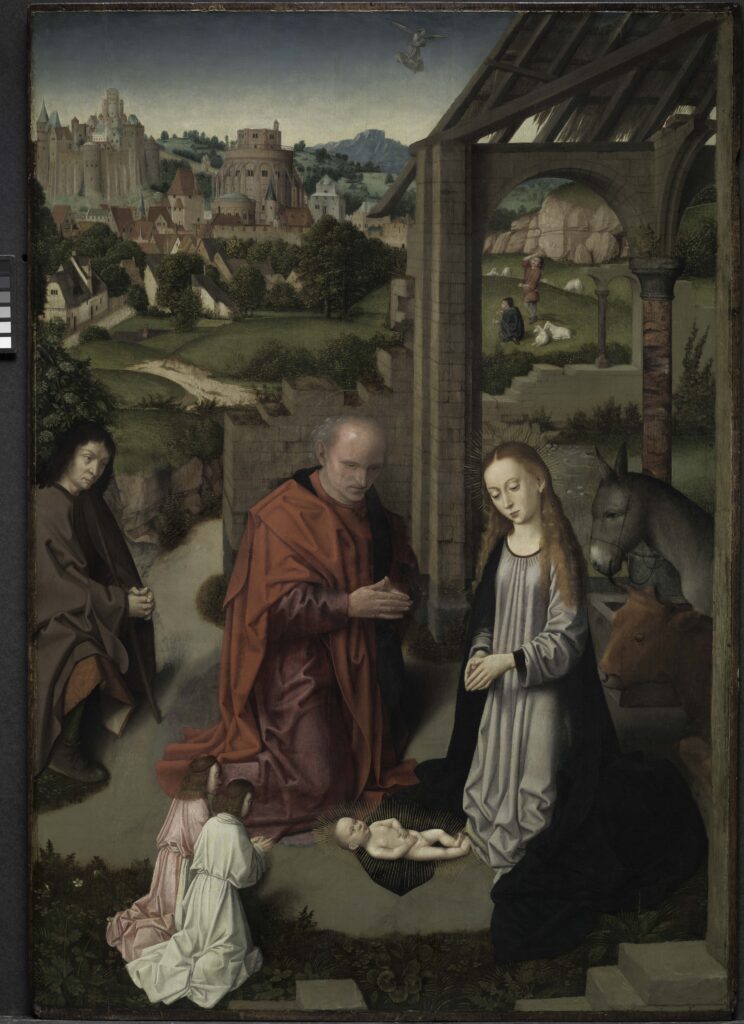 De twee schilderijen die we in het Gerarddavidbuitenmuseum tegenover elkaar gehangen hebben, vertonen veel overeenkomst. David heeft ze in dezelfde periode aan het begin van zijn loopbaan in Brugge geschilderd. Maria is hetzelfde roodharige meisje dat te zien is op het vroegste schilderij van de Annunciatie (de engel Gabriël die haar komt verkondigen dat ze een goddelijk kind verwacht). Jozef knielt in een rode mantel met een kaarsje in zijn linkerhand (precies hetzelfde is ook op andere schilderijen van de geboorte te zien), ‘gekke Henkie’ die door een gat in de muur toekijkt is ook een figuur die vaker voorkomt (hij maakte ook deel uit van de dagelijkse samenleving). Een interessant detail vormt het huisje links boven: sterk vergroot zie je hoe Jozef en Maria met hun bagage-ezeltje aankloppen bij de herberg waar de waard het gebaar maakt van Helaas! We zijn vol!