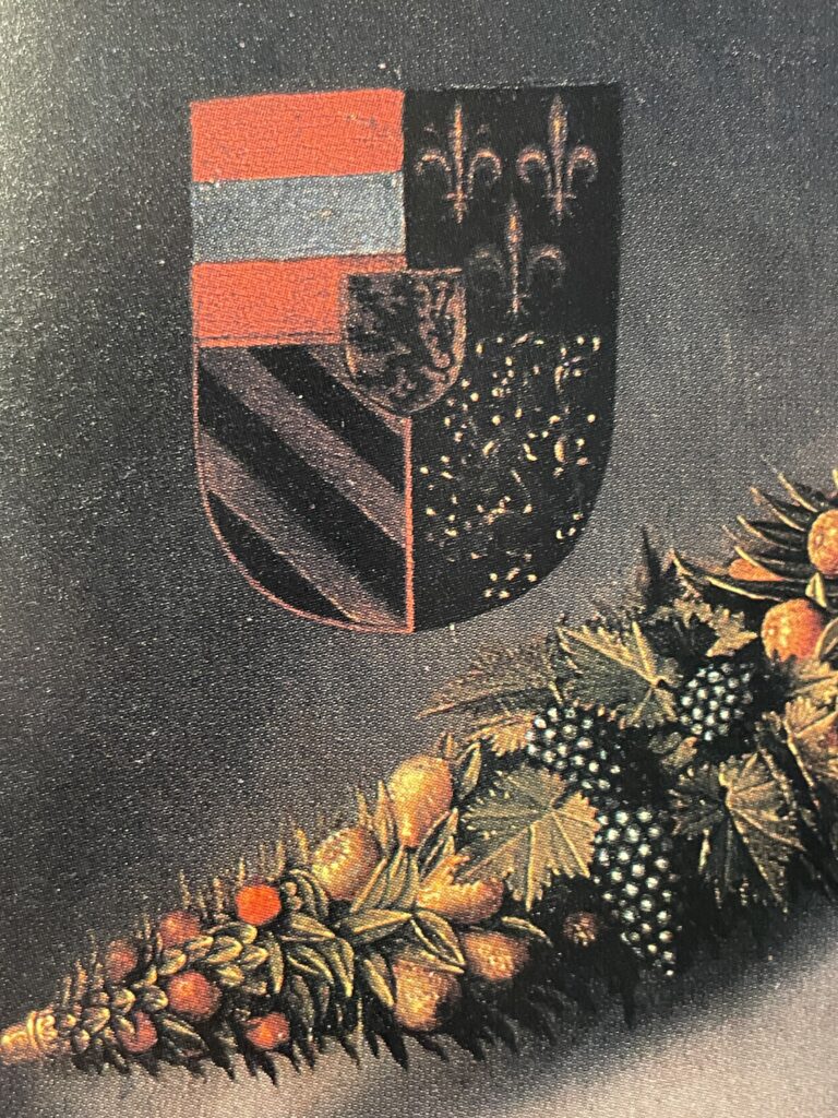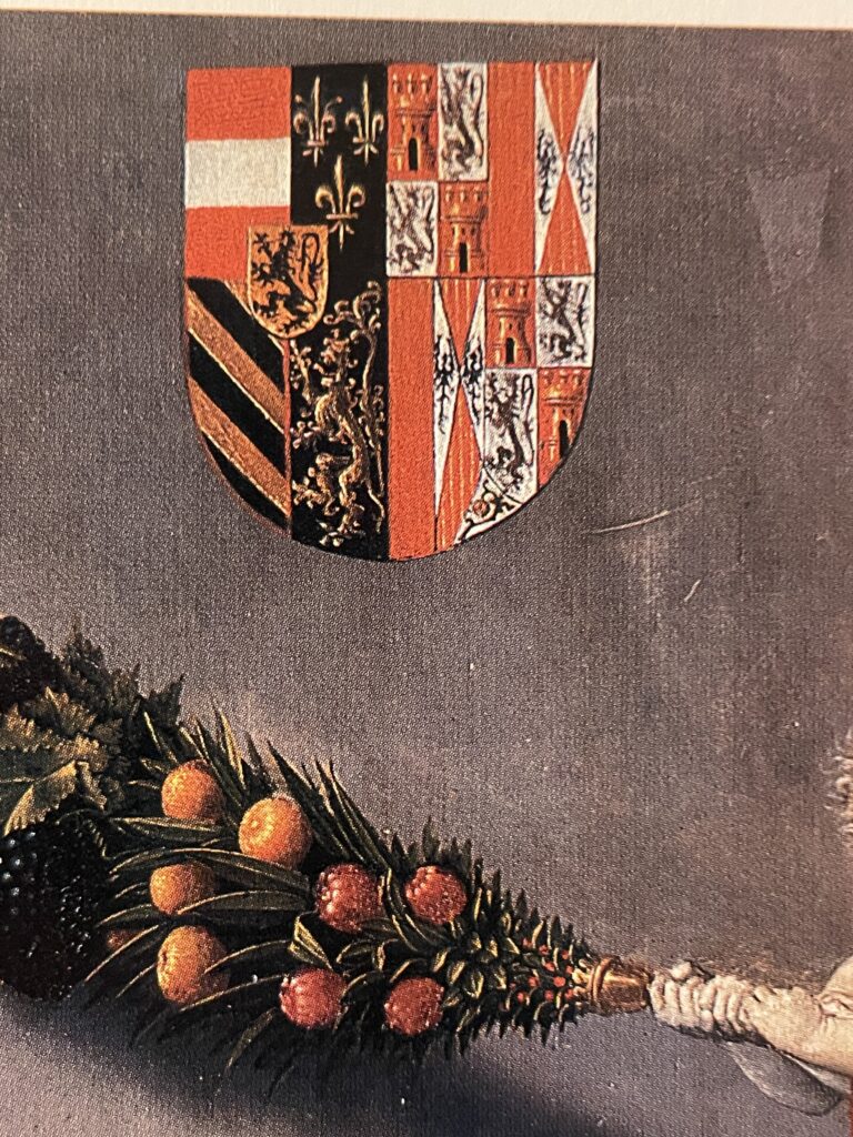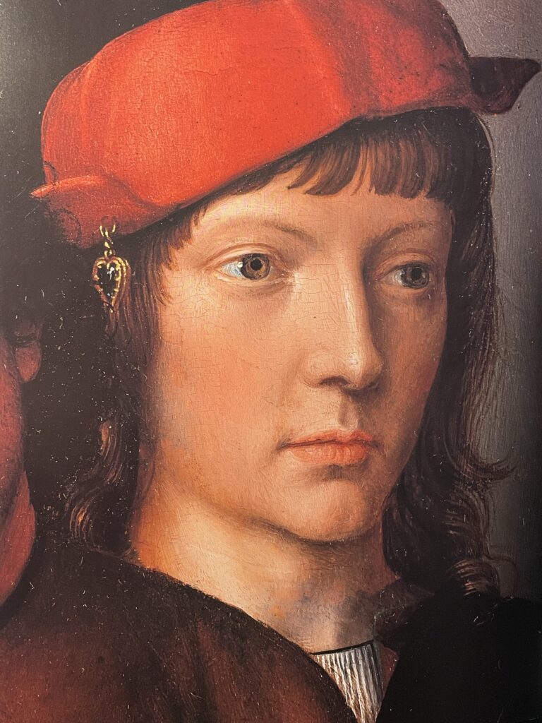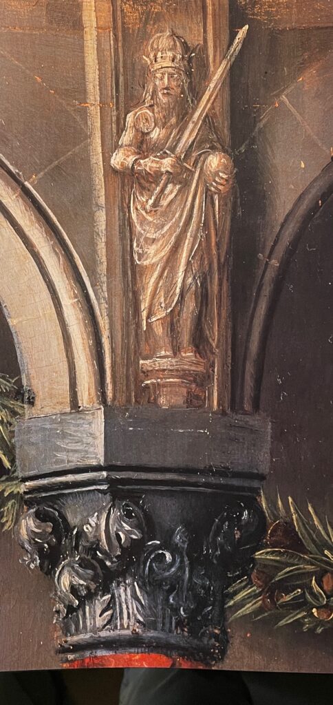 Op het linker paneel linksboven staat het oude stadhuis van Brugge afgebeeld, met daarnaast de Poortersloge, waar destijds de rechtspraak plaats vond (het gebouw bestaat nog steeds). Trouwens, beide schilderijen staan boordevol symboliek. Helemaal rechts bovenaan het rechter schilderij staat de Keizer op de middelste zuil van de loggia en op het linker paneel de wapenschilden van Filips de Schone (de 15-jarige van het schilderij) en Johanna van Castilië, die voorbestemd was om zijn echtgenote te worden (wat met deze hint aldus al werd aangegeven).